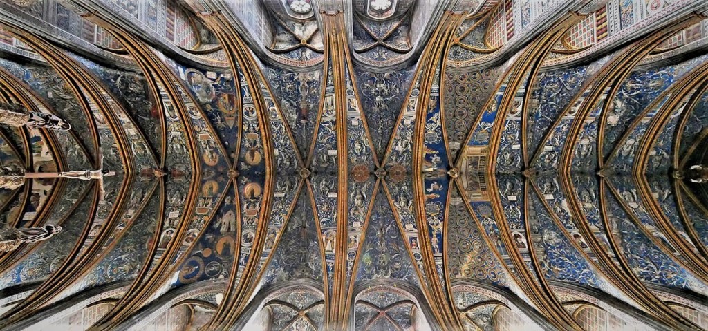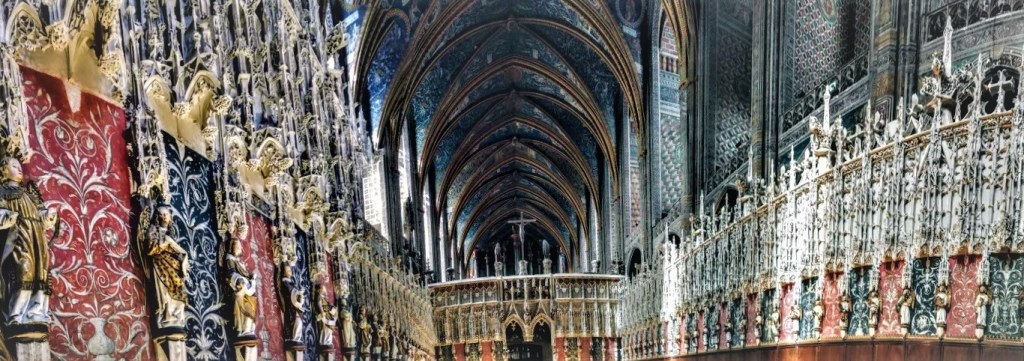 A cathedral born in the throes of Cathar heresy. Church-fortress, warrior church, monumental cathedral! She’s grand, she’s fierce, she seems impregnable. See its narrow windows pierced like murderers! Albi the Red was erected to protect itself as much from the wrath of men as from the wrath of God. For in these Languedoc lands, home to Cathar heresy, the Church had to fight for its preservation. But let us not see in the red bricks drawn from the clay molasse of the banks of the Tarn any allusion to the dried blood of the Albigeois cathars! And yet, isn’t it with 18,500 m2 of frescoes and decorations, the largest painted cathedral in Europe?