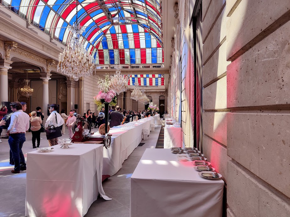 Par la droite, le Salon Murat. Un lieu chargé d’histoire puisqu’il fut la salle de réception principale du palais du temps de Murat. Il est orné d’un décor militaire en cinq tableaux selon la vogue de l’Empire. Entre les deux fenêtres donnant sur le jardin, on distingue la colonne Vendôme surmontée de la statue de l’empereur (beau-frère de Joachim Murat). Et dans le coin, “petit business” des goodies (made in France) des Jeux olympiques 2024. Gros succès !