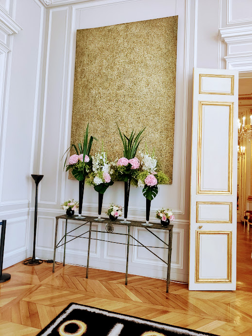 Point de tapis rouge pour nous recevoir jusqu’au vestibule d’honneur. C’est ici, selon le protocole, que le président accueille les chefs d’Etats étrangers : sol pavé de marbre blanc et rouge surmonté d’un immense lustre de bronze doré et, faisant face à l’entrée, la très saisissante sculpture d’Arman, hommage à la Révolution française (un bloc de quelque 200 drapeaux de marbre blanc à hampe doré).