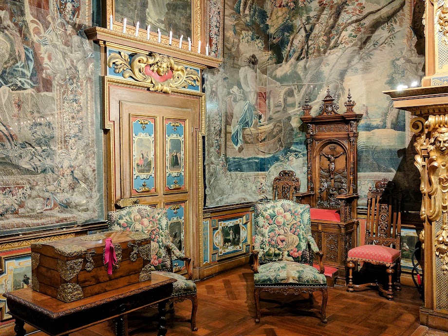 Somptueuse décoration de la chambre du roi avec en particulier, le plafond à caissons (scènes de l’histoire de Persée et Andromède) et les lambris (support de l’histoire de Théagène et Chariclée). Voir également le lit à baldaquin recouvert de broderies persanes datant de 1550, dans lequel a dormi le roi Henri IV