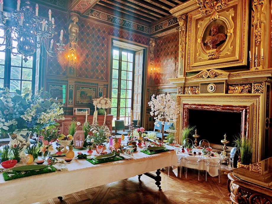 Salle à manger est constitués de 34 panneaux de bois, oeuvre de Jean Monier illustrant le roman espagnol de Cervantès, Don Quichotte. Le mobilier est sculpté aux armes de la famille Hurault (croix bleu azur et soleil rouge). Surmontant la table à manger de 30 convives, ce lustre hollandais du XVIIIe siècle. Voir aussi la cheminée monumentale de style néo-renaissance dorée à l’or fin et surmontée du buste du roi Henri IV.