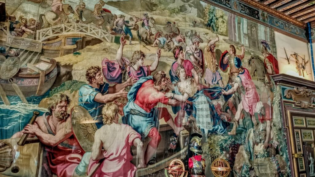 Comment ne pas admirer cette splendide tapisserie des Gobelins (l’enlèvement d’Hélène) jamais restaurée ? Voir aussi la magnifique cheminée à l’instar de celle du roi, ses motifs ont été peints et restaurés à la feuille d’or comme les deux amours qui semblent tenir une des rares toiles de Jean Monier : “la mort d’Adonis”. La Salle d’Armes est la plus grande pièce du château de Cheverny. Elle est restée en l’état depuis le XVIIe siècle avec un coffre de voyage ayant appartenu au roi Henri IV, des collections d’armes, des armures de tournois, une chaise à porteur Louis XV, etc.