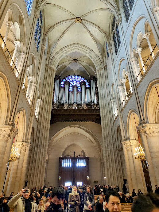 Under the rose window on the west side of Notre-Dame, the great organ was spared by the fire. It has 115 stops and 8,000 pipes. It took four years to renovate it. Photo © François Collombet