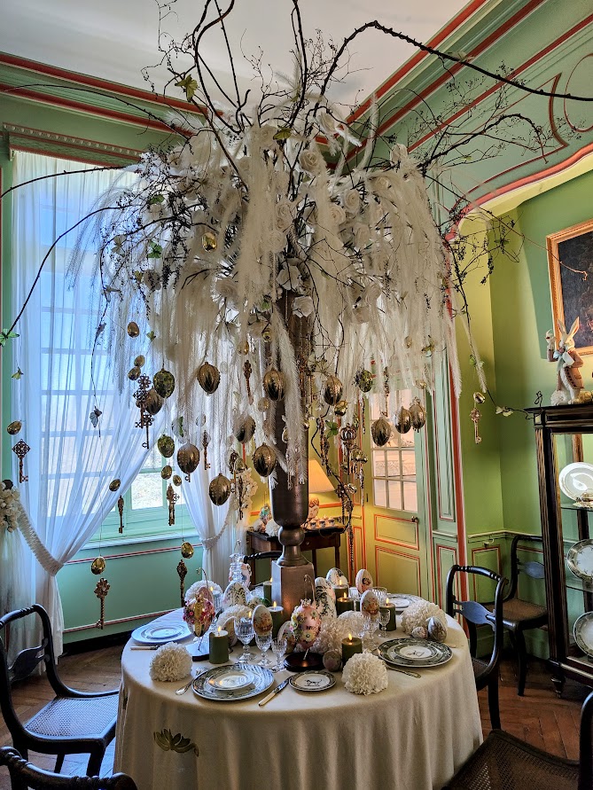 Dans la grande salle à manger du château, la table est dressée pour célébrer Pâques et le printemps