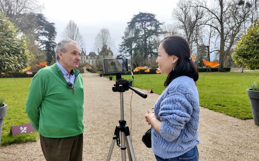 Le marquis Charles-Antoine de Vibraye interviewé par Aliya Syzdykova journaliste de la presse Kazakh et vice-présidente de l’Association de la Presse Etrangère. Serait-il question d’un accord hautement symbolique entre les tulipes de Cheverny et celles du Kazakhstan patrie historique de la tulipe ? Un accord qui n’aurait pas déplu à Paul de Vibraye (1809-1878) le célèbre paléontologue à qui l’on doit l’aménagement et la plantation des grands arbres du parc. Photo © François Collombet