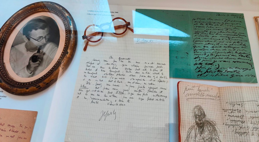C’est dans un Paris en partie déserté par les artistes et intellectuels qui formaient avant-guerre leur entourage que nait cette amitié. Les rapports étroits entre ce couple d’intellectuels et Giacometti perdurera après la guerre. Ils auront de nombreuses relations communes à l’image celles qu’ils eurent avec Michel Leiris ou Jean Genet (un modèle pour Giacometti). Giacometti est sans doute le seul artiste que Sartre ait admiré sans réserve” dira Simone de Beauvoir. Cette amitié entre les trois perdurera jusqu’à la mort d’Alberto Giacometti en 1966. Le sculpteur n’est-il pas devenu un personnage à part entière dans l’œuvre romanesque de Simone de Beauvoir : Le Sang des autres (1945) ! Tout juste une petite brouille entre Sartre et Giacometti lors de la parution des Mots dans Les Temps modernes, en 1964, chez Gallimard.