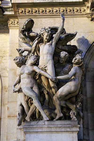 Façade principale de l’Opéra Garnier donnant place de l’Opéra à Paris dans le 9e arrondissement. Ornant cette célèbre façade, quatre groupes en haut-relief en pierre représentent la poésie, La musique instrumentale, Le drame lyrique et surtout la danse de Jean-Baptiste Carpeaux  dont les personnages dénudés furent un objet de scandale. Photo © François Collombet