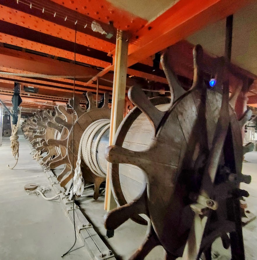 Opéra Garnier, salle des Cabestans. Au théâtre, de nombreux termes techniques et superstitions sont issus de la marine. Parmi eux, le cabestan qui est un treuil à axe vertical utilisé pour virer l’ancre ou les cordages. À l’Opéra, l’axe d’un cabestan est horizontal. Les contrepoids permettaient de soulever les décors en réduisant l’effort. Le poids à déplacer correspondait au poids du décor moins poids du contrepoids. Photo © François Collombet