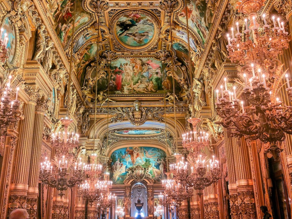 Les dimensions du grand foyer sont impressionnantes : 54 m de long, 13 m de large, 18 m de haut. Le plafond, d’une superficie de 500 m2, est peint par Paul Baudry qui a mis plusieurs années pour réaliser son œuvre. Le jeu des miroirs et des fenêtres accentue encore les vastes dimensions de ce foyer, à coup sûr, l’attraction numéro 1 des visiteurs. Photo © François Collombet
