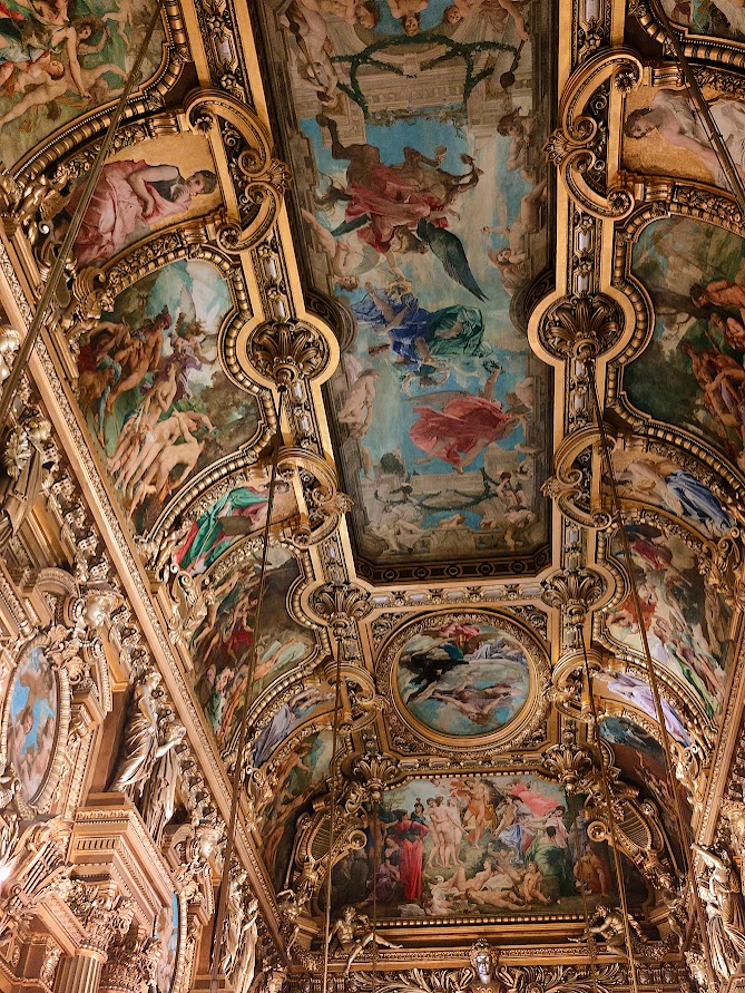 Cette immense galerie rappelle le Château de Versailles. Elle est aussi à l’image des salles de fête des palais italiens. Son architecte Charles Garnier dut se battre pour ne pas modifier ses dimensions. Pour lui, le principe d’une salle élevée attire la vue vers le haut, une impression réhaussée par un plafond central peint qui continue l’architecture et dont les lignes décoratives allongent la voûte. Au plafond, des scènes mythologiques avec la représentation des thèmes de l’histoire de la musique. Au centre, un grand caisson consacré à la musique, encadrée par deux plafonds ovales représentant l’un la comédie et l’autre la tragédie. Voir également les têtes dorées de Charles Garnier et de sa femme sous les traits de Mercure et d’Amphitrite à la clef des grands arcs qui précèdent les salons d’angle.