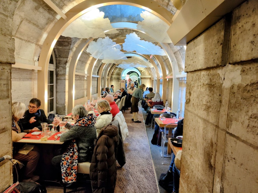 Ici, au foyer de la Madeleine, se côtoient le midi, avocats, banquiers, employé(e)s, secrétaires, étudiant(e)s, touristes, retraité(e)s. On dit même que la Cour des comptes a son couvert (ils sont voisins). Des gens seuls, des accidenté(e)s de la vie, des riches, des pauvres qui trouvent ici de la solidarité, de la fraternité (tarif d’1 € pour les plus démunis)* et surtout le sourire et la bonne humeur des bénévoles qui cuisinent, vous placent et vous servent. On se saluent, on se souhaite la bonne année, on se répartit dans deux des trois grandes salles (60 m de long au total) toutes en voûtes de nuages et de bleu décorées par l’artiste JR (artiste français né en 1983, photographe et réalisateur qui s’est fait connaître pour ses collages photographiques).